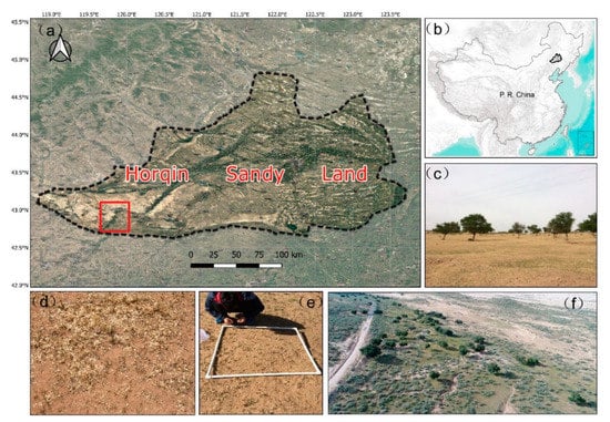 Horqin Sandy Land is located in a typical agriculture and pasture interlaced zone on the eastern edge of the Mongolian Plateau [] (Figure 1). Horqin Sandy Land, with an area of 5.23 × 104 km2, is one of the largest sandy lands in China []. Due to the sandy and loose soil, sparse vegetation cover, and its semiarid climate condition, this area is highly prone to wind erosion and desertification. Exacerbated by ever-intensifying human activities such as livestock grazing and agricultural expansion and climate changes (e.g., the decreasing precipitation) in the past years, the risk of desertification and land degradation remains very high [,]. The continuous land degradation of Horqin Sandy Land attracts much attention from researchers and policymakers. A series of national ecological restoration projects, such as the Grain for Green Project and the Beijing and Tianjin Sandstorm Source Treatment Project, was implemented to fight for land degradation and preserve the fragile ecosystems [].