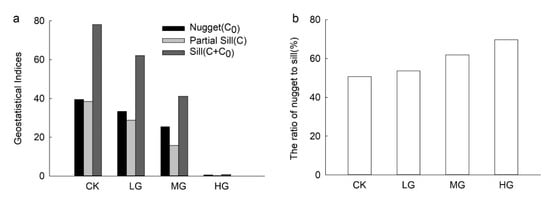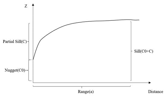 Geostatistical indices, including nugget, partial sill, sill, and the ratio of nugget to sill, were calculated with geostatistical models (Figure 2). In geostatistical models, one core concept is the variogram. A variogram characterizes the spatial continuity or roughness of a data set []. For each variable (Z), the variogram (γ) can be calculated from all sample pairs with lag distance h between locations (s) as