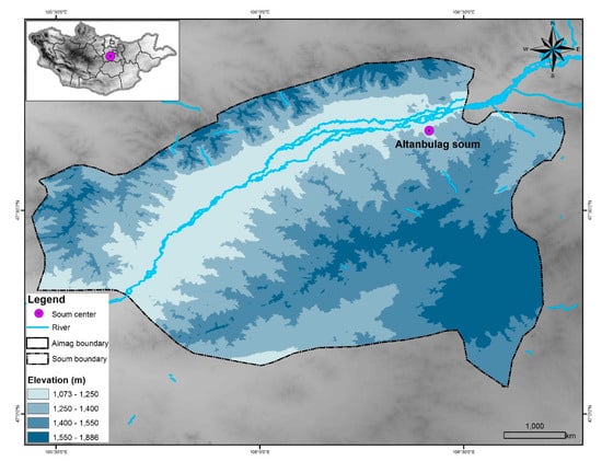 Mongolia is a landlocked country situated in East Asia and bordered by China and Russia. Most of the country is steppe grassland, falling into three major ecological zones: mountain steppe, steppe, and desert steppe. Roughly one-fifth of Mongolians are pastoralists. The study area was the Altanbulag soum (rural district) in the Tuv aimag (province) in central Mongolia (Figure 1). Altanbulag soum is located approximately 50 km southwest of Ulaanbaatar, where a variety of land uses and land use actors are found. The area, divided by the Tuul river, has a combination of climate zones. The north of the river is mostly forest steppe and steppe, while the south is steppe and the Gobi Desert.
