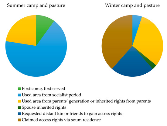 The results of the open question revealed that most mobile pastoralists established summer camps in places they were used to living for many years. In response to this, we inquired about the factors for selecting summer and winter camps (Table 2 and Figure 3). The most common reason for choosing a summer camp was “used area during socialist period (before 1990)” (67.5%), followed by “used area since parents’ generation” (22.5%). According to the minority of herders who answered “first come, first served,” the reason was that “the summer pasture is not owned by anyone, we move to find a place with good grass conditions” (Herder, Place 2 and 11/42). The four herders who responded were neither migrants nor inexperienced. Regarding the winter camp, they acquired rights in a manner that complied with the Land Law, such as through inheritance from parents, rights obtained by registering themselves, or shared use.