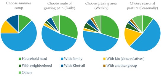 We conducted a survey of mobile pastoralists to investigate the relationships between herders when selecting a summer camp and grazing practices. First, we asked whom the herders consult when choosing a summer camp (Table 3 and Figure 5). Most herders select a summer camp by consulting their family. Next, we listed whom the herders consulted when selecting their daily/weekly/seasonal grazing routes and grazing pastures (Table 3 and Figure 5). Similar to the selection of summer camps, approximately half of the pastoralists selected grazing routes and grazing pastures after discussing them with their families. In addition, only the head of the household determined the daily grazing path and weekly grazing area, and his kin (close relatives) were slightly more involved in selecting the grazing pasture. Decisions about seasonal events may feel more important than decisions about daily grazing practices: