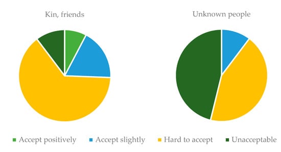 We examined the relationships among herders focusing on migrant pastoralists and pastoralists. First, we asked whether migrants would be accepted if they came into a nearby grazing area. The migrants were classified as kin, friends, or unknown people, and the results are shown in Table 4 and Figure 6. Approximately half of the pastoralists answered that they would not accept the migrants if possible, regardless of kinship status. The most common reason extended was that “already there are so many pastoralists that there is no surplus on the pasture to accept migrants” (Herder, Place 21/42) or “there was no space when other people came before” (Herder, Place 36/42). However, a few pastoralists responded that they would eventually accept or help their kin in trouble.
