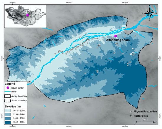 Adapted from Tshukihara [41] and Humphrey and David [27], three main categories of land use actors were identified for this study: permanent residents (farmers, soum residents, and wildlife park wardens), semi-pastoralists, and mobile pastoralists (including migrant pastoralists). This study does not consider permanent residents. Semi-pastoralists often host foreign tourists during the summer to supplement their income. Mobile pastoralists earn their livelihood solely from pastoral income. Migrant pastoralists in this study are defined as those who arrived in the Altanbulag soum after its transition to a market economy.