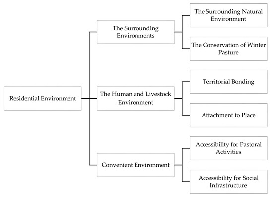 Outcomes of the survey at the Altanbulag soum correspond to the (i) surrounding environment, (ii) human/livestock environment, and (iii) convenient environment. Furthermore, six sub-items were identified to explain these categories based on the results of informal interviews and summer camp locations, and the residential environment index system in the rangeland around Ulaanbaatar was constructed as shown in Figure 8. Summer camp selection based on the ecological and geographical environment has changed to include a combination of the three above-mentioned dimensions due to the social and economic changes brought about by Mongolia’s transition to the market economy.