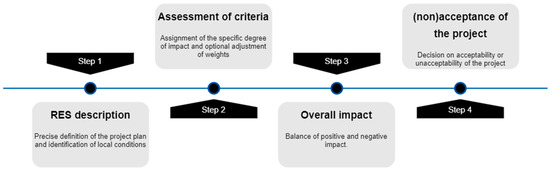 The RES impacts are divided into four categories: economic, social, environmental, and innovative. The aim was to involve all significant positive and negative impacts and provide a complex view at the municipality level; therefore, 23 criteria were defined. These criteria are subject to a procedure which starts with a detailed analysis of the RES project. Based on the RES description and local conditions, each criterion is assessed in the interval (−3; 3). Considering the weights, the total impact can be calculated.