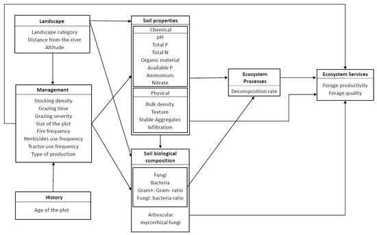 The objectives of our study were to (1) characterize current livestock management practices in the geomorphologically diverse landscape of the Marqués de Comillas study area, and (2) understand how these practices affect soil quality and related supporting, regulating and provisioning ecosystem services. More specifically, we explored the direct and indirect effects of livestock management practices on soil-based supporting and regulating ecosystem services and their linkages to two provisioning ecosystem services: forage productivity (quantity of palatable plants) and forage quality (forage protein concentration), supplied by these grasslands (Figure 1). We established 31 plots in different landscape categories (alluvial areas and low-hills) in the Marqués de Comillas study area, documented management practices, and measured soil quality indicators, litter decomposition potential, and forage productivity and quality.