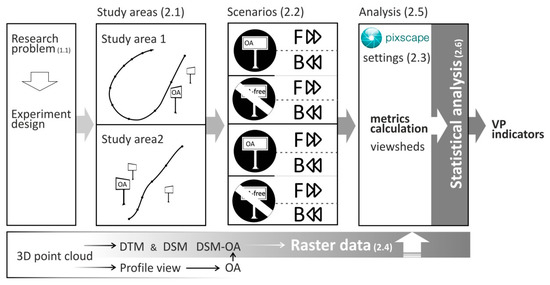 The methods flowchart. The research problem of measuring VP with the use of tangential view landscape metrics was examined on the example of two case study areas (2.1). The experiment scenario (2.2) assumed measurements in OA-free and OA scenarios, each time in both F and B directions of the case-study observation routes. The input data (2.4) were imported into Pixscape software (2.5) and the results were statistically evaluated (Section 2.6).