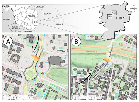 Experimentation occurred in the city of Lublin, Poland, one of the most dynamically developed cities in the country [72] where approximately 1037 OA are hosted by commercial agencies [73] (more OA are not officially inventoried). Lublin was selected for its diverse topography (terrain variations up to 70 m), which enables this type of experiment. To account for topographical environments as well as variation in the appearance of OA in Lublin’s urban landscape, two study areas with contrasting topographies were selected. Both sites were located in the city center and were spaced 4 km apart.