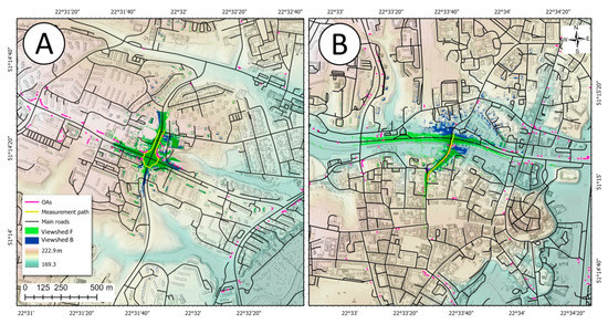 The OA location and the results of directional viewsheds modelling (green is forward direction, blue is backward): (A) Area 1, (B) Area 2.