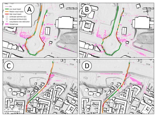 Metric values were calculated for all observation points in both the F and B directions. This was repeated for both the OA-free scenario and the OA scenario. All calculations were performed at default angular precision 0.1° [84]. The observer point locations and view range parameters were common for tangential visibility metrics as well as for cumulative viewshed analysis. The resulting metric values were the object of statistical analysis (Section 2.6) and interpretation regarding VP. Examples of tangential views were the object of visualization. Furthermore, to provide an example of cartographic visualization, a three-color scale has been adopted to indicate low, medium, and high visual impact along the measurement path. Green was assigned to the first quartile of metric values, yellow to the second, and red to the third. Thus, the presence (red) or absence (green) of VP phenomena in the analyzed cityscape are visualized, where the color orange represents what we propose to be a transition zone (details in Figure 6a–d).