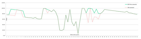 Despite these results, the Dmax metric turned out to be extremely valuable for VP diagnostics with some exceptions arising from the uphill slope of Area 2 in the B direction, which occluded long-distance views. As Dmax measures the distance to the farthest located visible pixel of the 2.5D landscape model, its values only changed when OA happened to obstruct the line of sight to the farthest located pixel. Therefore, Dmax was found to be a very selective indicator of VP. Instances of VP indication are visualized in Figure 7, where the Dmax curves for the OA and OA-free scenarios diverge.