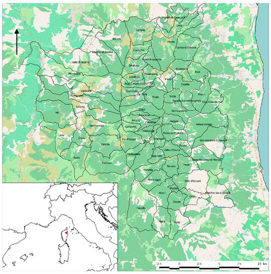 Corsica is a mountainous island located in the French Mediterranean basin. Corsican agriculture mainly consists of small ruminant dairy farming and beef cattle ranching in the mountains and hills, with arboriculture and vine growing on the coastal plains. Castagniccia is a small area in the northeastern part of Corsica. It is a very rural region, far from the main urban areas in the middle of the northeastern Corsican mountains. This region has an extension of 45,015 ha (representing 5% of the total Corsican area) and includes 69 municipalities (Figure 1). The current landscape of Castagniccia was inherited from an ancient agricultural system based on terrace cultivation, chestnut growing, and small ruminant breeding [34]. This traditional system required a large amount of manpower and thus led to very high population density (more than 100 inhabitants/km2 in the 19th century). The system collapsed at the beginning of the 20th century, leading to a decrease in population and to cultivation being substituted by very extensive breeding or land abandonment [35]. The permanent population of Castagniccia is now ageing, having a density of about 16 inhabitants per km2. About 16% of the adult population works in agriculture. In this region, as in many Mediterranean LFAs, steep slopes severely limit agricultural mechanization and labor-extensive suckler-cow breeding has developed since the 1980s [31,36]. In Castagniccia, this activity has sometimes also replaced traditional breeding (i.e., dairy ewe and dairy goat breeding). At present, agriculture in this area mainly consists of beef cattle farming for meat, small ruminant dairy farming (sheep and goats), pig farming (in abandoned chestnut orchards), and chestnut growing. Farms operate at a low level of capitalization on livestock production. Most farms—except those with only cows—process (i.e., into cured meats, cheese, chestnut flour, and pastry) and directly sell almost their entire production, which is the best way to improve value add [37]. Due to a lack of manpower, there have been few attempts to restore the chestnut orchards, which gave the name “Castagniccia” to the entire area.