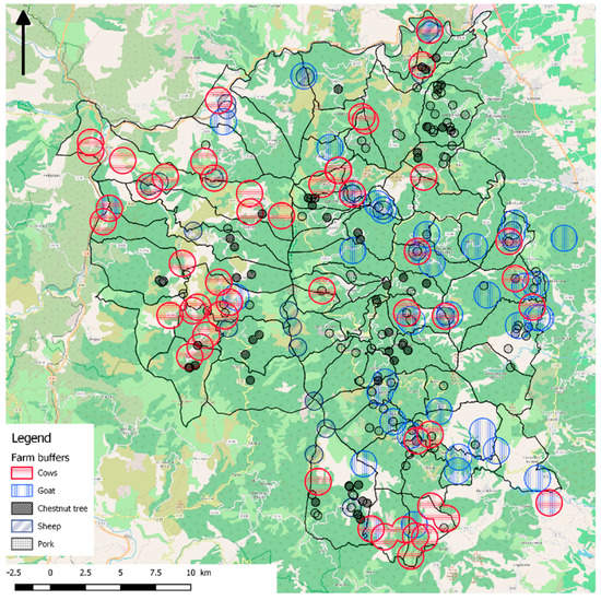 In this phase, we aimed to assess if land-cover in 1994 and 2012 and land-cover change between these two dates were related to the livestock production type. Around each production site, the area in which land cover is likely to be impacted by the presence of animals depends on the physical characteristics of the animals (i.e., mobility and diet preferences leading to grazing a rather large or small area) and on the livestock management practice (e.g., parking, shepherding). According to the animal behavior and management of the Corsican herds reported in the literature and expert knowledge [20], we drew different buffers around the 1990s and 2012 production sites: small buffers around pig production sites (15 ha), medium-sized buffers around sheep production sites (70 ha), and large buffers around goat and suckler-cow production sites (150 ha). After the first assessment, we did not consider pig production sites, as this livestock type does not really have an effect on vegetation management and is completely different from the breeding characteristics of the other livestock typologies. Figure 2 shows these buffers around the 2012 production sites.