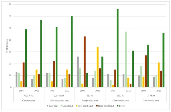 The change in area of each land-cover from 1994 to 2012 indicated a decrease in bare-soil, grassland, and high scrubland areas, with an increase in low scrubland and forest areas for WA, NI, sheep- and cow-only categories. There was also a general increase in forested areas concerning each kind of area, except for goat-only areas. For the goat-only areas, 35% of the area impacted was no longer forested in 2012; however, this was probably due to fire, rather than grazing (see below).