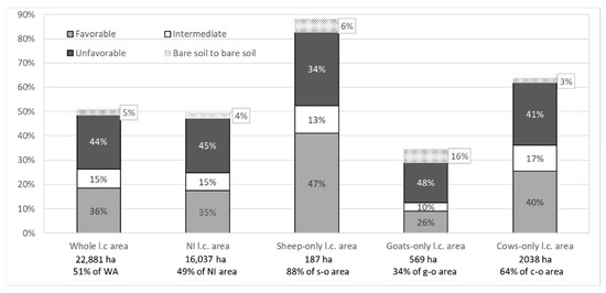 The land-cover analysis shows that, in 1994, goats were mainly located in forested areas, while sheep and cows were located in areas with lower cover, corresponding to their preferences in terms of grazing areas, according to expert opinion. Transitions observed in the 1994 low-covered area (Figure 4) showed that sheep-only areas had the highest percentage of class 1 transitions and the lowest percentage of class 2 ones. Cow-only areas showed percentages close to, but slightly better than, those observed for the non-impacted area, suggesting the negligible (or, at least, weak) impact of such production on low vegetation growth. Sheep and goats performed better on grassland (Figure 5), followed by cows. Concerning low scrubland, sheep followed by cows performed better than others, while goats had a similar impact on vegetation to that observed in the WA and NI areas. Finally, the goat-only areas had the worst impact on high scrubland, while sheep breeding performed the best.