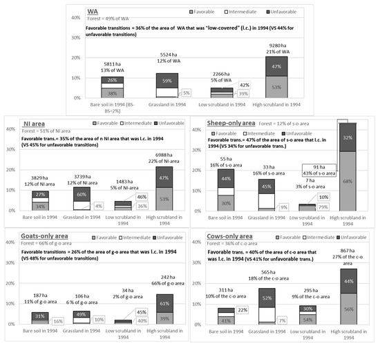 Figure 4. Importance of the different kinds of transitions for the 1994 “low-covered” animal-specific areas. Each bar describes the change observed from 1994 to 2012 for a given area. The total low-covered area (ha) of each category is mentioned below each bar.