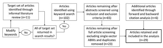 A second round of screening was performed using the full text of each remaining article. Articles were primarily screened to determine if at least two sectors were explicitly considered in the ABM and/or overall modeling approach. The article must have addressed the research questions related to interactions and/or trade-offs between two or more food, energy, or water sectors. For example, many ABM applications focused on water resource systems (see [30]), and analyzed environmental impacts, infrastructure design, and/or policy in response to shifting water supply and/or demand without explicitly analyzing the effects of those shifts on food or energy production/consumption. Consistent with usage in the wider FEWS research domain [1,2], food systems were broadly conceived as agricultural systems, ranging from subsistence to industrial farming and staple to bioenergy crops. Fisheries were also considering in this definition of food systems, but no ABM applications in that domain were still included at this stage. Excluding articles with single-sector ABM applications reduced the data set to 23 articles. Finally, we conducted backward and forward citation analysis with Google Scholar. Six more articles were included after applying the inclusion and exclusion criteria, which increased the total number of articles to 29 used in the review (Supplementary Table S1).