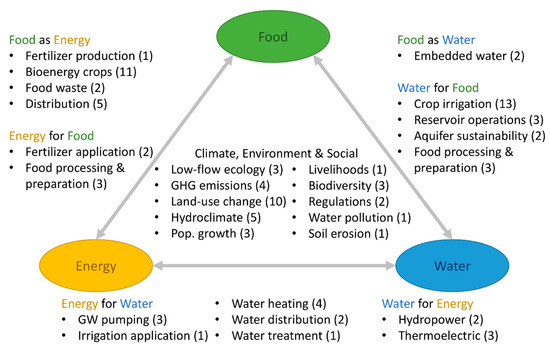 Food–energy–water system (FEWS) linkages studied in the reviewed agent-based modeling (ABM) applications. Additional interactions with climate, environmental, and/or social impacts were also present.
