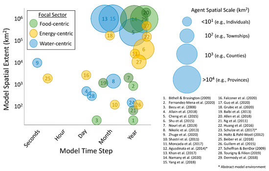 Configurations of model spatial extents and time steps and spatial scales of agents represented in agent-based model (ABM) application in food–energy–water system (FEWS) research. Circle size indicates the spatial scale of agent representations, and circle color is associated with the FEWS sector perspective from which the ABMs were designed. Notes: (1) when two or more models possessed the same spatial extent and time step, circles were offset to reduce occlusion. (2) ABM applications indicated with an asterisk implemented non-spatial, abstracted model environments, and thus were not plotted in the figure.