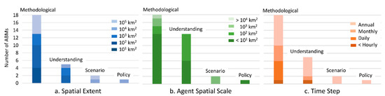 Similarly, there were no clear relationships between the stated, primary purpose of the ABMs and design choices of the ABMs spatial extents, spatial scales of the agents, and time steps (Figure 4). The majority of models focused on methodological aspects of ABM implementation chose smaller-scale agents (e.g., individuals or households) simulated at annual time steps. This reflects the dominance of agricultural applications. Models that were used to primarily improve system understanding were applied in relatively small spatial extents, with smaller-scale agents, and simulated at annual time steps. However, there was a wide range of variability in the model design choices based on models’ stated purposes, which suggested that ABM applications in FEWS were to some degree context dependent.