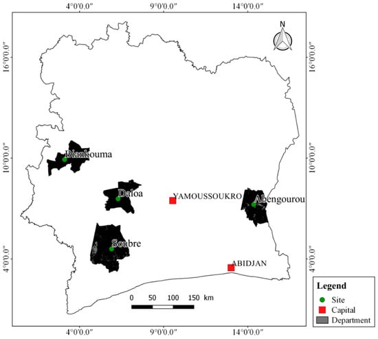 - Chatelain, C.; Dao, H.; Gautier, L.; Spichiger, R. Forest cover changes in Côte d’Ivoire and Upper Guinea. In Biodiversity of West African Forests: Ecological Atlas of Woody Plant Species; Poorter, L., Bongers, F., Kouamé, F.N., Hawthorne, W.D., Eds.; CABI Publishing: Wallingford UK, 2004; pp. 45–82. [Google Scholar]