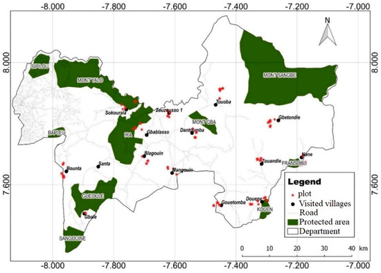 - Tiébré, M.-S.; Ouattara, D.; Kpangui, K.B.; Kouassi, D.F.; N’Guessan, K.E. Floristic diversity of the Foungbesso region in the forest-savanna transition zone in the West of Cote d’Ivoire. Int. J. Biol. Chem. Sci. 2016, 10, 1007–1016. [Google Scholar] [CrossRef][Green Version]
