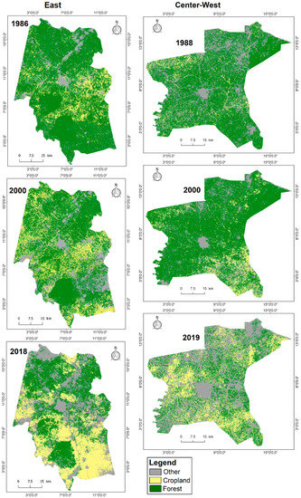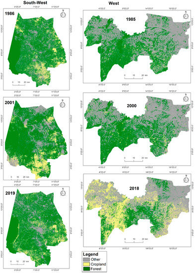 In the Western Region, perennial crops production was not frequent before 2001 (Figure 4 and Figure 5) but these crops are more adopted between 2001 and 2019. Overall, a reduction in natural areas was observed during the study period (Figure 4). During this period, forest area decreased from 248,837 ha (51.54%) in 1985 to 121,474 ha (25.16%) in 2019 (Table 3). Considering the cultivated areas, they increased from 17,763 ha (3.68%) in 1985 to 145,707 ha (30.18%) in 2019.
