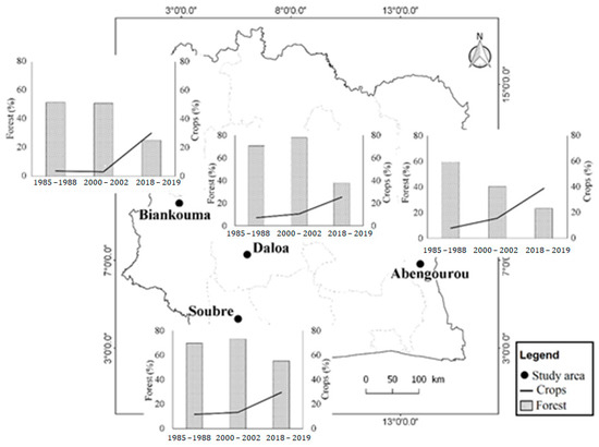 In the new cocoa production region in the West of Ivory Coast, a reduction in forest area estimated at –51.18%, −1.22%, and -50.58%, respectively, was observed during the periods 1985–2019, 1985–2002 and 2002–2019. Regarding crops, their cover increased by 720.28% and 874.77% respectively for for1985 2019 and 2002−2019 periods. However, their covers decreased by −15.85% from 1985 to 2002.