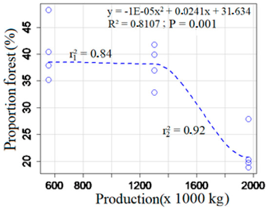Relationship between national production and proportion of forest from 1985–1986 to 2018–2019.
