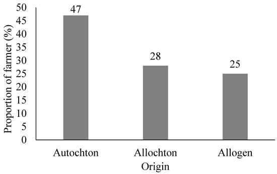 Cocoa farmers in the Biankouma regions are dominated by non-native populations; 47% of producers were autochthonous (from the region) versus 53% of non-natives. These producers are composed by allochton (person from the country but not from the region, 28%) and allogen (person not originally from the country, 25%) (Figure 8). Moreover, statistics showed a concentration of non-native producers from the West Ivorian region in the localities located near the protected areas (Figure 9).