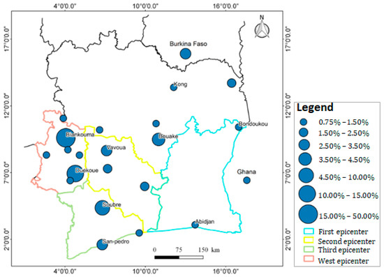 However, the scarcity of the forest due to the pressure on this resource is leading cocoa farmers to adapt to the new environmental conditions by recolonizing old fallows as observed in the first and second cocoa epicentres (Figure 3). In this way, a return of the cocoa economy to these former abandoned areas can be expected. In addition, image analyses coupled with field observations have shown that populations do not continue to establish cocoa farming in the pre-forest savannahs of western Ivory Coast as [16,17,18,19,20]. Even if the results are still too recent to better appreciate them, this practice, if successful, would also make it possible to carry out cocoa production in the savannas included in the forest regions or in the entire pre-forest regions of Ivory Coast. All these practices would help to make cocoa production in Ivory Coast sustainable and generate substantial income for the State and improve the living conditions of the farming populations.