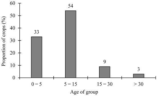 The majority of the cocoa farmers in the study area are in the age range between 5 and 15 years old (Figure 13). These are followed by plantations in creation of less than 5 years old, which represent 33% of the plantations. Mature plantations (15–30 years) and older plantations (more than 30 years) account for 9% and 3%, respectively.