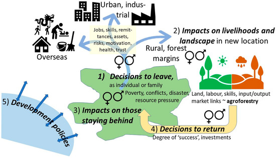 Contrary to the long-term attachment to place that prevails in “myths of origin” and cultural constructs of place-based identity [1,2], humans have a history of dispersal and migration [3], as reflected in our complex DNA and linguistic signatures [4]. Migration has been the demographic basis of the expansion of our species spreading to all parts of the world, adapting to a wide range of circumstances and learning how to cope with variability and diversity. Both cultural and genetic evidence suggests that human dispersal and migration were not a one-way process and that links to areas of origin were maintained through any means of communication and transport that was accessible in given periods of human history and development. Cultures have absorbed newcomers while migrants kept a cultural attachment to areas of origin, creating the rich “unity in diversity” fabric that characterizes many Asian countries [5]. Human dispersal and migration have had ethnobotanical consequences, with a large number of semi-domesticated trees and crops spreading along with humans as well as the knowledge of how to use them [6,7]. Working across Indonesia, anecdotes of how agroforestry and local forest management practices were inspired by experiences elsewhere during “circular migration” or were traced back to migrants from other parts of the country are commonly heard [8] but appear not to have been systematically analyzed. In the current “lockdown” response to the COVID-19 pandemic [9], both positive and negative aspects of such human movement call for a more nuanced analysis as part of the Sustainable Development Goals [10]. Migration can involve a radical decision to uproot and try one’s luck elsewhere for a variety of social, political, economic, and environmental reasons [11,12] or be a more gradual process wherein temporary and circular migration precedes “permanent” migration at the individual or household level, with family members potentially following suit [13]. The decision to migrate circularly or permanently is usually taken step by step in response to perceived success or failure and interacting with external circumstances, such as policies in both the area of origin and area of the temporary new residence. While many studies have zoomed in on specific parts of the decisions to move and/or return, a holistic perspective requires a human life-cycle approach that is not easy to obtain experimentally but can be constructed by combining separately studied pieces of a larger puzzle.