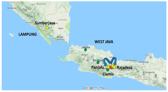 Our second case study analyzed migration patterns, dynamics of migrant and stayer communities, migration decision making, and gender relations, with a focus on Ciamis District, West Java, where there is a close migration connection to coffee-growing landscapes in West Lampung District, Lampung, as shown in Figure 3. In Ciamis, the study was conducted in two villages in Panjalu Sub-district and two villages in Rajadesa Sub-district. Panjalu is in the northwest of the district and is the capital of Ciamis. Rajadesa is in the eastern part. Both villages are categorized as agricultural communities that rely heavily on farming as their source of livelihoods.