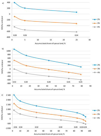 Annuity of net present value (ANPV) (contributions to land, management, and risk; CLM&R) of spruce plantation at site quality classes (SQC) G24–G36 using genetically improved spruce seedlings growing 15% faster than unimproved seedlings at real interest rates of 2%, 3%, and 4% in northern (a), central (b), and southern (c) Sweden. The x-axis indicates the accumulated share (%) of the existing spruce land in each region according to [67]. For (a) the remaining 75% of spruce land is SQC < G24.