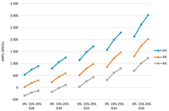 Warmer climate in the future may increase spruce growth by two SQCs, i.e., from G28 to G30 and from G34 to G36 [68]. This would increase ANPV by 200 and 500 SEK, respectively, at 15% breeding improvement and 3% interest.