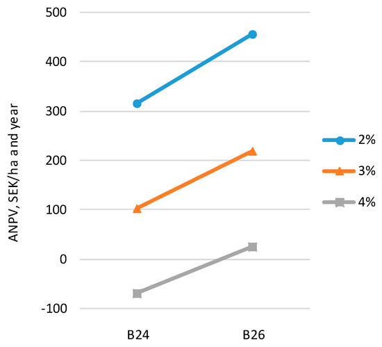 Figure 3 shows ANPV of natural regeneration of birch on B24 and B26 on forest land after final felling, cleansing, and soil scarification assuming that it, without delay, produces stands with sufficient number of birches to make full use of the land´s production capacity for birch wood. At 3% interest, ANPV is 100 SEK/ha on B24 and 200 SEK/ha on B26. It is considerably higher at 2% but insignificant or negative at 4% (Figure 3).
