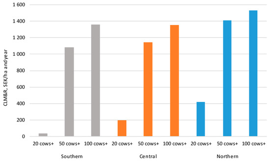The typical beef production in forest districts with abandoned and marginal agricultural land is similar to the examined alternative with small (2 ha) scattered pastures and small herds (≤ 20 cows+), giving negative CLM&R (Figure 5). Therefore, these enterprises can continue only as long as there are appropriate existing buildings for wintering the cattle and farmers willing to work for a low hourly compensation. When these resources run out, beef production and other agriculture activities will cease in many forest districts and the abandonment of land will probably continue unless the production can become more cost-efficient. This abandonment process has been addressed in previous studies [6,7,11,13,15]. However, in the previous studies, the possibilities of making beef production sustainable by creating large pasture-forest mosaics have not been considered.