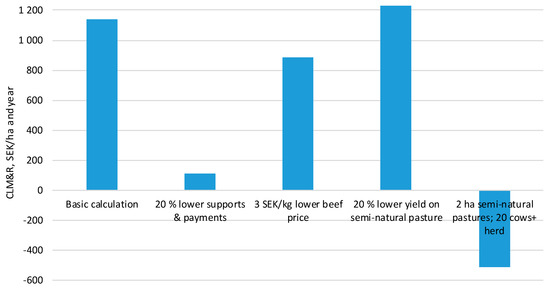 The profitability of grazing-based organic beef production is highly dependent on supports and environmental payments. A 20% reduction in these would wipe out almost the entire CLM&R (Figure 5). A reduction of the beef price by 3 SEK/kg (e.g., a removed premium price on organic beef) would not reduce the profitability nearly as much (Figure 5). Indeed, the risk of reduced support and payments may be a further reason why the calculated CLM&R may be too small to stimulate investment in large-scale beef production in areas with much abandoned and marginal agricultural land.
