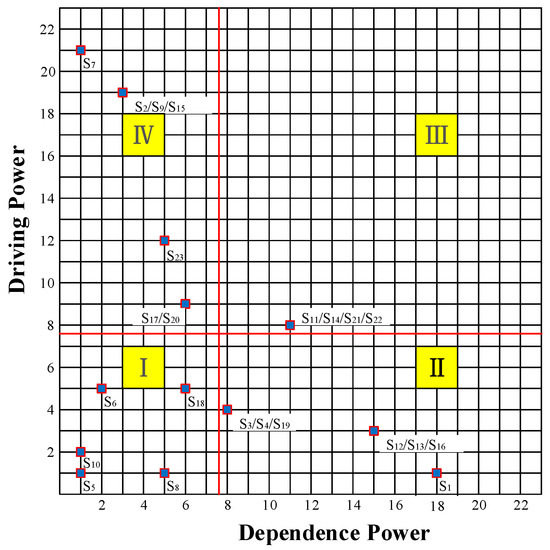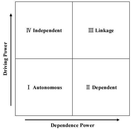 Unlike ISM, which can only judge the direct relationship between factors, MICMAC can assess the degree to which factors interact with each other. The analysis result of MICMAC can be expressed in the form of a quadrant diagram. The ordinate of the quadrant diagram represents the driving power of the dynamic factors, and the abscissa represents the dependence power, so it is also called the driving–dependence matrix. The driving power is determined by the number of factors that each factor can reach, and the dependence power is determined by the number of factors that reach each factor. Accordingly, these factors can be divided into four quadrants: I Autonomous cluster, II Dependent cluster, III Linkage cluster, and IV Independent cluster, as shown in Figure 1.