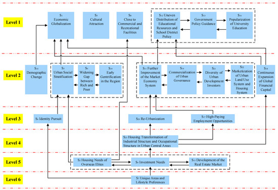 Finally, according to the level division of the dynamic factors and the effect relationship between the dynamic factors reflected by the accessibility matrix, the interpretative structure model of the dynamic factors of super-gentrification is constructed. In order to make the hierarchical structure of the model more clear, only the direct effect relationship between the dynamic factors is considered in the model. The ISM graph is shown in Figure 2.