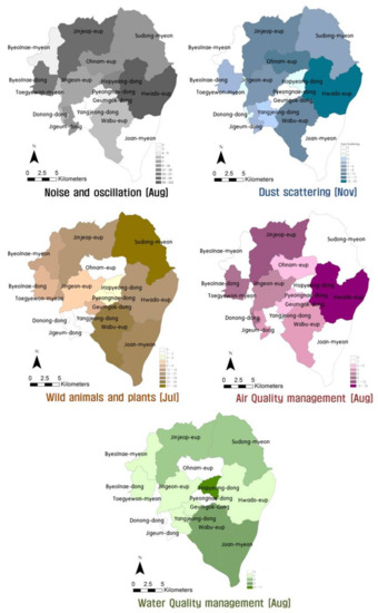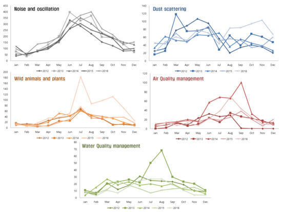 This study performed a spatial analysis on the characteristics of complaints from 1 January 2016, to 31 December 2016 (the year of the most recent data) for months in which the most public complaints were filed. A time-series analysis revealed that there were numerous public complaints about noise and oscillation, wildlife, air quality management, and water quality management during the summer months of June, July, and August. Complaints about dust scattering, however, were filed inconsistently throughout each year (Figure 3).