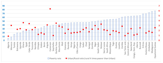 Poverty in Africa is persistent. Currently, about 48% of Africa’s population, or approximately 450 million people, live in extreme poverty (less than US $1.25 per day), with 63% of the continent’s poor living in rural areas depending on agriculture for their livelihoods [27]. About 75% of the world’s poorest countries are in Africa. The ten countries with the highest proportion of people living in extreme poverty are in Sub-Saharan Africa [28]. About 70% of African countries (40 of them) have more than a 40% poverty rate showing that a large majority of the country currently has a severe poverty rate with a rural–urban divide (Figure 2). Most of the poor dwellers in SSA rely on annual crops and ecosystem services for their survival. The rural poor poverty rate is, in general, 2 to 6-times more than the urban poverty rate. In this context, rural migration into cities becomes a mere transfer of poverty with additional social consequences.