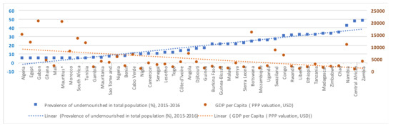 Most data show a gap between food demand and food supply in Africa and this will increase with rapid urbanization [37]. Country income level is not enough to guarantee sufficient access to food. Additionally, agronomic solutions are not genuine solutions to food security. Exploring the food-system framework gives better access to quality food and that means producing more than enough staple food [11]. Many factors affect food production such as the current climate, agricultural practices, market dynamics, existing infrastructures for food conservation and transformation, etc. Many countries that are food sufficient rely on their economic performance (cash return from other commodities) to alleviate food and nutrition gaps by enabling food purchase elsewhere [11]. In general terms, gross domestic product (GDP) is inversely correlated to the prevalence of an undernourished population (Figure 3).