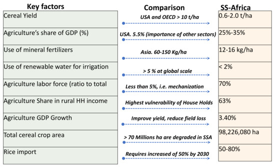At the same time, the time window to bridge the gap is rather short, only 10 years from when this paper was written. This means only 10 growing seasons to double food production where lands are largely arid or semi-arid and almost all parts are very vulnerable to climate change, land degradation, and deforestation [10,11]. Therefore, compared to other baselines from other continents, Africa has the steepest slope and the largest array of challenges to face. Africa also has the greatest opportunity to make the leap directly to prosperity without severe environmental and social degradation [12,13] because of its exceptional richness of land resources [8].