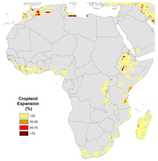 Molotoks et al. [90] found that the cropland expansion projected by 2050 is to result in a substantial loss of habitat in biodiversity hotspots such as in Ethiopia, Madagascar, the South Coast of West Africa, and South Africa, with some sites losing part of their last remaining habitats.