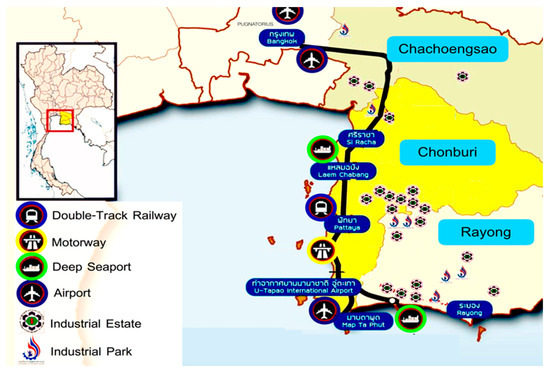 - Eastern Economic Corridor Office. The Potential of Chachoengsao Chonburi Rayong. Available online: https://www.eeco.or.th/pr/news/EECFocusThePotentialOfChachoengsaoChonburiRayong (accessed on 26 November 2019).