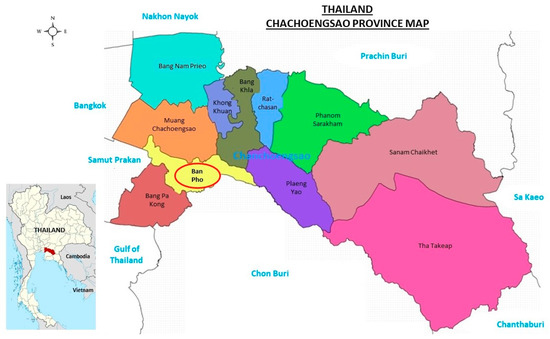 Ban Pho is one of the 11 districts in the CCS province. The district is located about 40 km east of Bangkok in Eastern Thailand (see Figure 2, below). The population of CCS in 2017 was 709,889 persons with Ban Pho having a population of 37,749 (5.3% of CCS) [43].