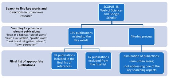The detailed conceptual analytical framework of this article is presented in Figure 1. To identify key questions related to existing lawn research and discover a research gap, we used a literature review based on SCOPUS, ISI Web of Sciences and Google Scholar (Figure 2). We specifically targeted key terms related to the particular ecosystem services and disservices of lawns (analysed in detail in Section 3). The search keywords were “lawn as a habitat”, “use of lawns”, “lawn as a symbol”, “plastic lawn”, “heat island mitigation by lawn”. To support the theoretical hypothesis of the relevance of nature-based solutions for lawns we also suggest and discuss the concept of two natures—different approaches to the vision of urban nature, including understanding and appreciation of lawns (Section 4). This concept helped us to explain the directions for lawn alternatives and their correlation with local natural and social conditions (Section 5). For lawn alternatives, the choice of case studies and references was based on the analysis of existing projects in which authors had participated (urban meadows, pictorial meadows, woody meadows, use of appropriate native groundcovers in private gardens etc.) or related literature review [22,23]. We prioritised the most recent publications (2011–2019) but also included earlier peer-reviewed works. There were 139 publications related to the key words; 92 publications were included in the final list of references and 47 publications were excluded from the final list. There were two main criteria for exclusion: non-urban areas and if the article did not address one of the key searching aspects (key words). The structural analysis of the literature review used in the paper is presented in Table 1.