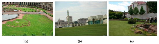 Since their development, lawns have required both space (land) and labour to provide constant management (especially in the early stages of their use in the 16th and 17th centuries). One important purpose of lawns was intangible—as symbols of power and prosperity. This important symbolism of power, order and control over nature can be found in all countries across the centuries—from French and English gardens designed for the aristocracy, to important contemporary public buildings and private residences of high-income urbanites around the globe [76,77] (Figure 5). From the 18th century onwards, lawns were designed according to the ideas of the picturesque movement (end of the 18th century to the beginning of the 19th century). At that particular time, smooth and gently rolling turf surfaces were revered as the most “beautiful” landscapes [76]. European countries and colonies designed numerous park-like landscapes according to this standard of English “beauty”.